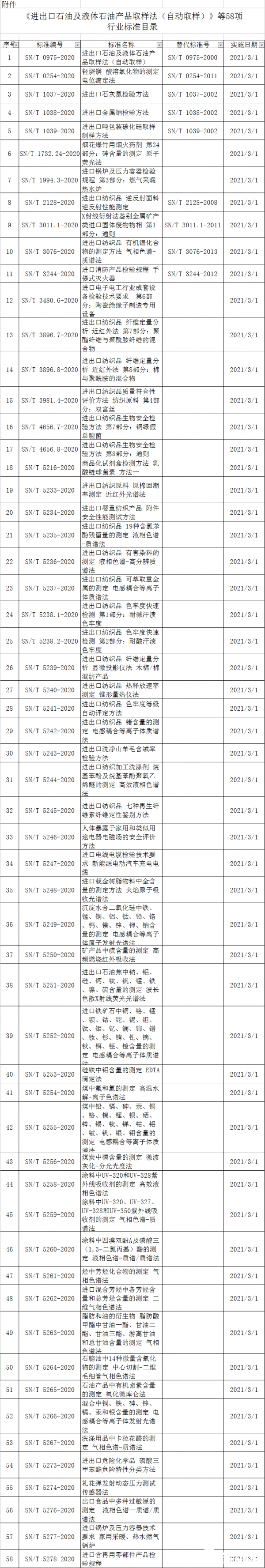 現(xiàn)發(fā)布《進出口石油及液體石油產(chǎn)品取樣法(自動取樣)》等58項行業(yè)標準(目錄見附件)?!哆M出口石油及液體石油產(chǎn)品取樣法(自動取樣)》(SN/T 0975—2000)等9項被代替標準自新標準實施之日起廢止。