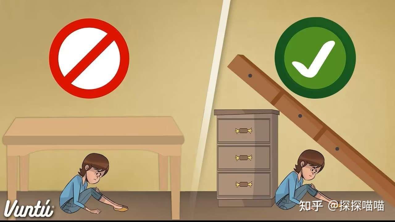 - 次選結(jié)實的桌子、床旁(注意:不是鉆下面,而是緊貼側(cè)面,形成“生存三角”)。