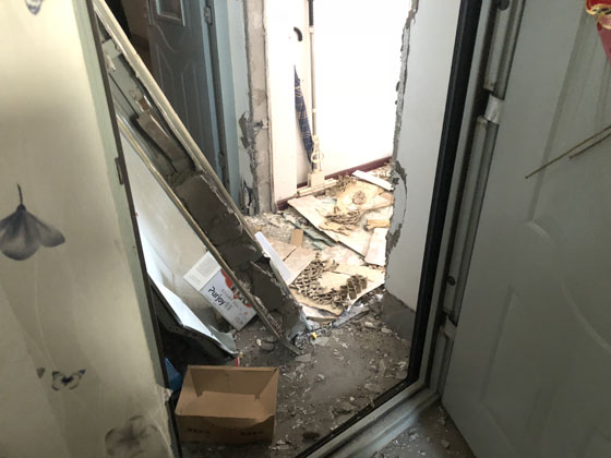 葉蘭的家住在小清河南路附近某小區(qū)六樓,和鄰居家在角落里兩側(cè),兩家的門不過一米左右的距離。此時他們不知道的是,鄰居家的門已被一股巨大的沖擊波頂開,整個門甚至連門框都被炸了下來,歪倒在墻面上。