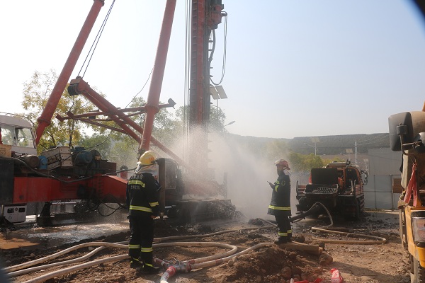 蘭州支隊(duì)七里河消防大隊(duì)第一時(shí)間到達(dá)現(xiàn)場(chǎng)參與處置,到達(dá)現(xiàn)場(chǎng)后發(fā)現(xiàn):現(xiàn)場(chǎng)管道仍處于天然氣泄漏狀態(tài),未有明火發(fā)生?,F(xiàn)場(chǎng)指戰(zhàn)員立即設(shè)置警戒線,對(duì)現(xiàn)場(chǎng)圍觀施工人員及群眾進(jìn)行疏散撤離,對(duì)泄露事故點(diǎn)毗鄰居民樓進(jìn)行人員通告疏散,同時(shí)設(shè)置水槍防護(hù)陣地。隨著增援中隊(duì)處置力量的到達(dá),現(xiàn)場(chǎng)處置指揮員七里河大隊(duì)大隊(duì)長(zhǎng),統(tǒng)一指揮調(diào)度現(xiàn)場(chǎng)事故處置力量:首先,結(jié)合現(xiàn)場(chǎng)街道路況,設(shè)置疏散組,對(duì)毗鄰居民樓全面進(jìn)行人員清查疏散。設(shè)置警戒組并專人看守,嚴(yán)防非事故處置人員進(jìn)入。然后在先期到達(dá)成立的消防水槍防護(hù)陣地基礎(chǔ)上,增設(shè)水槍防護(hù)陣地;其次調(diào)派到達(dá)現(xiàn)場(chǎng)的增援消防中隊(duì)兩臺(tái)水罐消防車全程待命,做好供水保障。