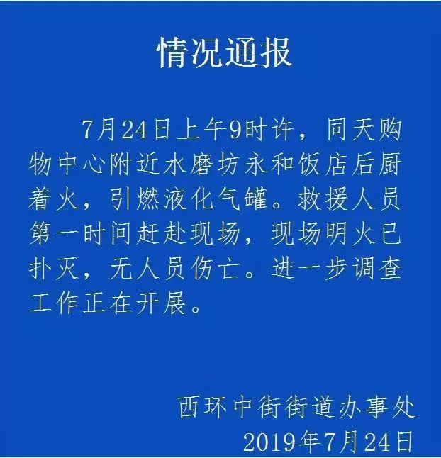 7月24日上午9時許,同天購物中心附近水磨坊永和飯店后廚著火,引燃液化氣罐。救援人員第一時間趕赴現(xiàn)場,現(xiàn)場明火已撲滅,無人員傷亡。進一步調查工作正在開展。