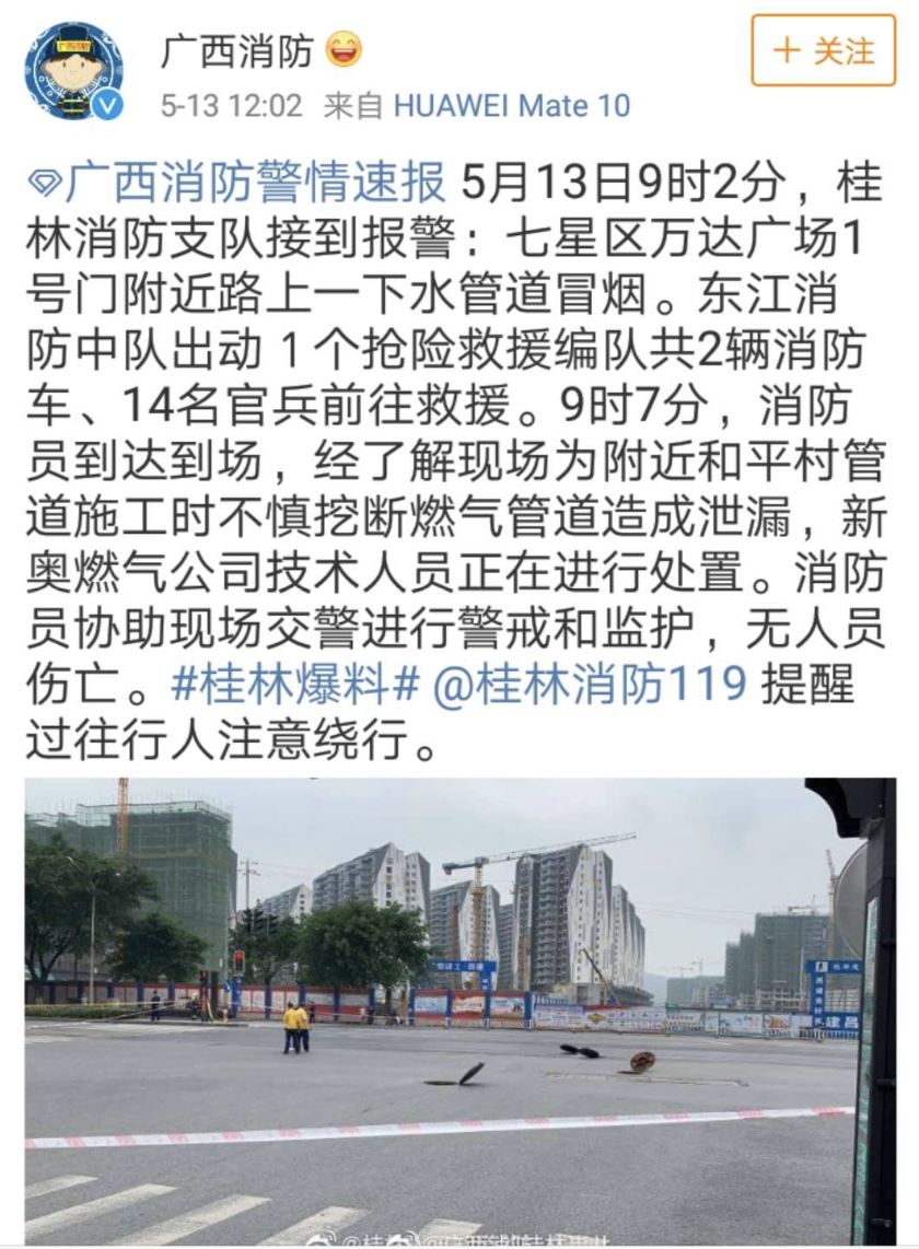 中午12時(shí),@廣西消防官微發(fā)布了一警情速報(bào):5月13日9時(shí)2分,桂林消防支隊(duì)接到報(bào)警:七星區(qū)萬(wàn)達(dá)廣場(chǎng)1號(hào)門附近路上一下水管道冒煙。9時(shí)7分,消防員到達(dá)到場(chǎng),經(jīng)了解現(xiàn)場(chǎng)為附近和平村管道施工時(shí)不慎挖斷燃?xì)夤艿涝斐尚孤?新奧燃?xì)夤炯夹g(shù)人員正在進(jìn)行處置。消防員協(xié)助現(xiàn)場(chǎng)交警進(jìn)行警戒和監(jiān)護(hù),無(wú)人員傷亡。