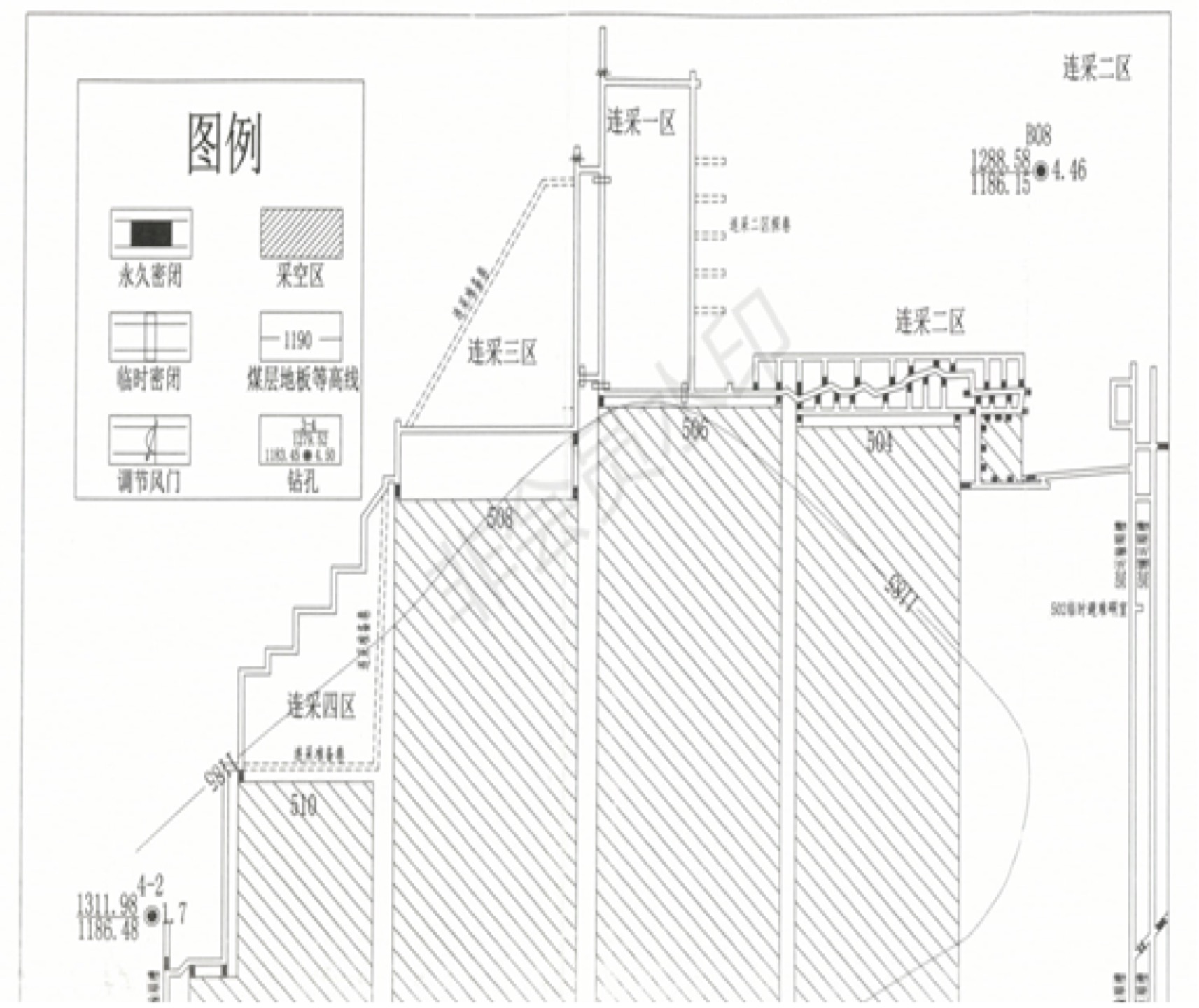 連采二區(qū)的開(kāi)采,沒(méi)有單獨(dú)編制工作面設(shè)計(jì)和作業(yè)規(guī)程,《5-1煤南翼連續(xù)采煤機(jī)短壁回采一區(qū)作業(yè)規(guī)程》中也沒(méi)有包含開(kāi)采連采二區(qū)的內(nèi)容。2018年12月初,連采隊(duì)從506進(jìn)風(fēng)順槽與二支巷交叉口處向西南掘進(jìn)到11.4米時(shí),與老空打通,采用紅磚壘砌臨時(shí)密閉封堵。2019年1月11日夜班,在二支巷回采了3個(gè)采硐后,從506進(jìn)風(fēng)順槽與三支巷交叉口處,垂直于506進(jìn)風(fēng)順槽向西南方向掘進(jìn)至41.2米處。