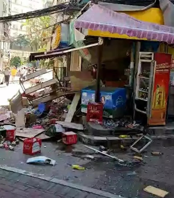 爆炸當(dāng)時(shí),士多店的墻塊、磚塊、雜物四下飛出,墻壁倒塌,甚至相隔數(shù)米之外的路邊樹葉也被震落下來(lái),商鋪內(nèi)更是一片狼藉。